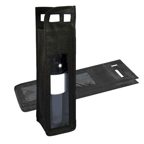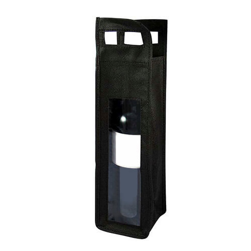 Porta botella de TNT para vino individual con ventana de PVC y mango transportable. Tela de 80 grs.