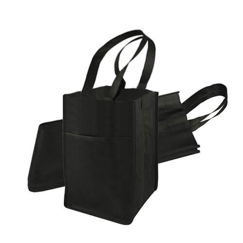 Porta botellas de TNT para cuatro vinos con mango transportable. Separadores interiores de TNT. Costuras y fondo reforzados. Tela de 100 grs.