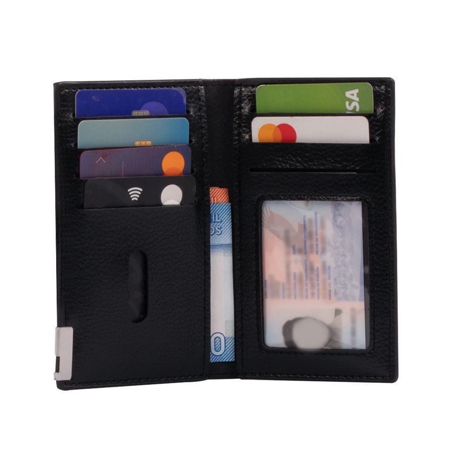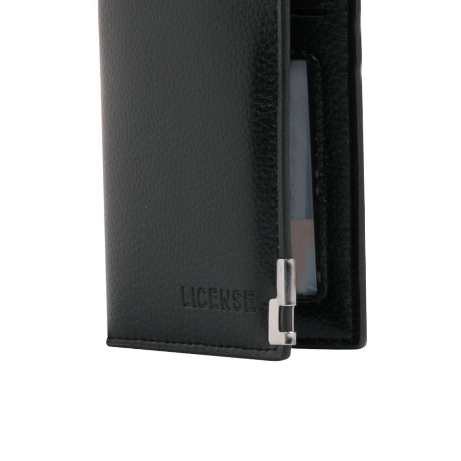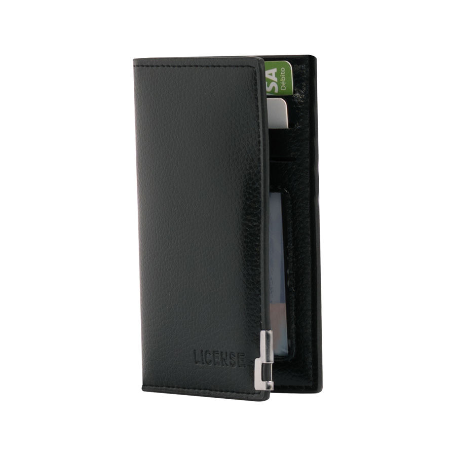 Billetera portas-tarjetas de eco-cuero negro, formato vertical, modelo «LICENSE». Contiene 8 compartimentos interiores. Presentación en bolsa frozen y caja de cartón forrado negro opaco.