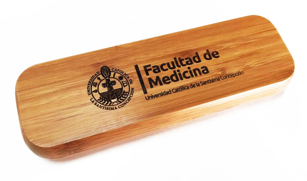 Set de escritura de madera de bambú. Bolígrafo de finas terminaciones doradas dentro de estuche madera ovalado.