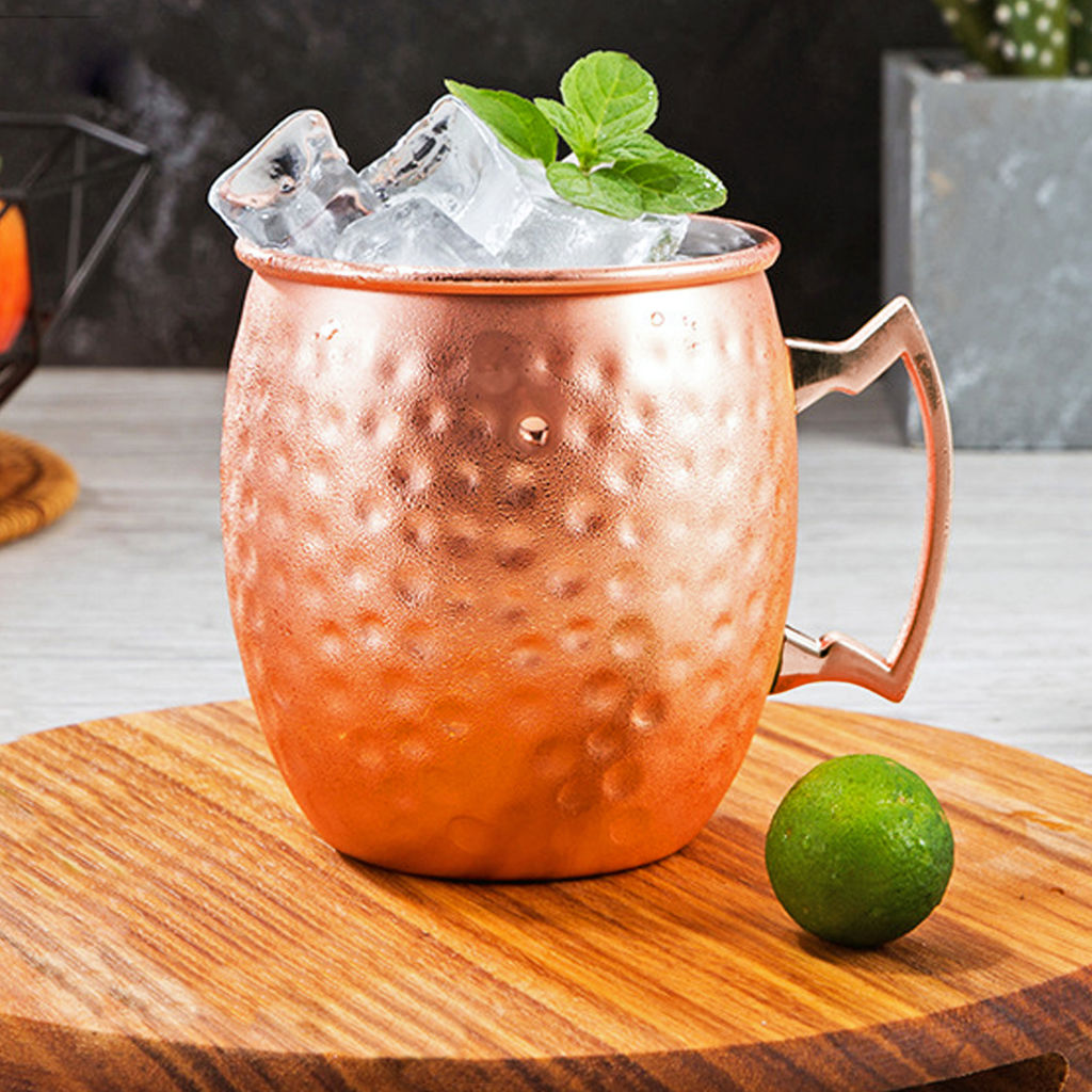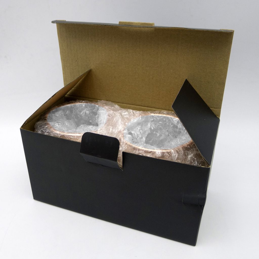 Set de 2 tazones de acero inoxidable electro plateados en cobre con puntos martillados y asa de Zamak. Presentación en caja de cartón negra.