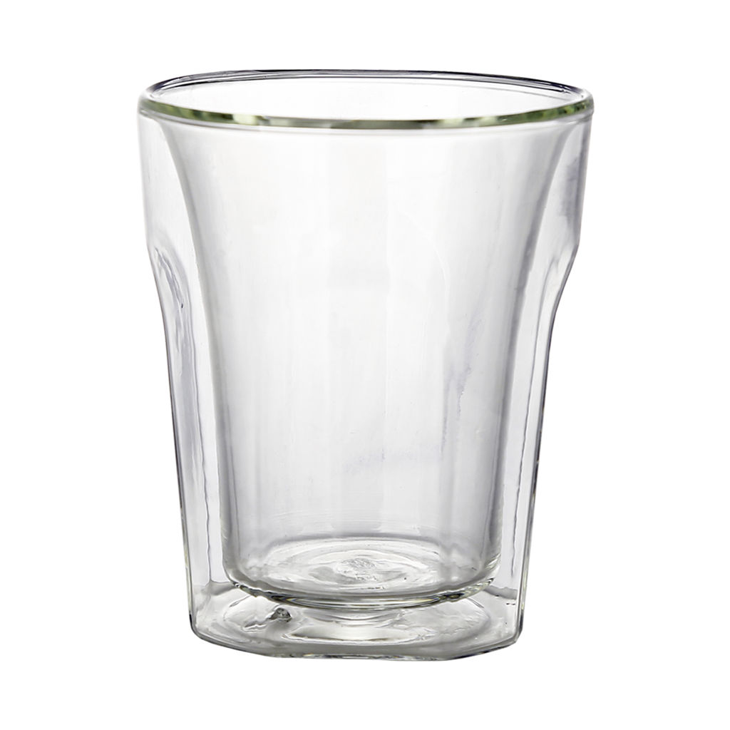 Set de 2 vasos de vidrio borosilicato doble capa. Presentación en caja de regalo negra con interior de cuna de polímero de polietileno negro.