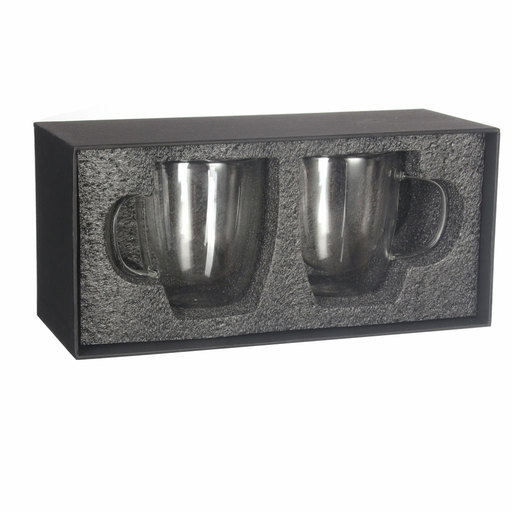 Set de 2 vasos de vidrio borosilicato doble capa. Presentación en caja de regalo negra con interior de cuna de polímero de polietileno negro.