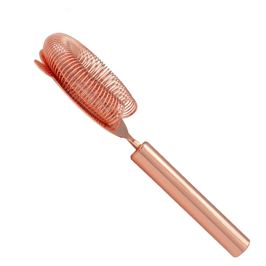 Fino regalo set de cóctel 5-en-1 de Acero inoxidale 304 SS, en acabado color cobre, incluye: coctelera 700ml con tapa 22cm, vaso dosificador doble (jugger) 8.3cm, tenazas para hielo 16cm, cuchara-tenedor revolvedor 23cm, colador/batidor 19cm. Producto BPA FREE, para el contacto con líquidos y alimentos. Capacidad coctelera 700ml. Presentación en caja de regalo de cartón laminado negro.