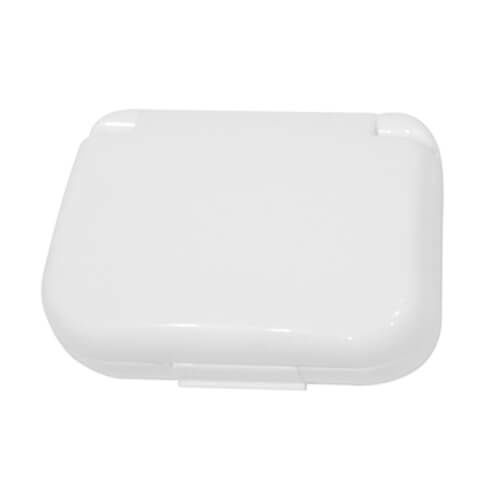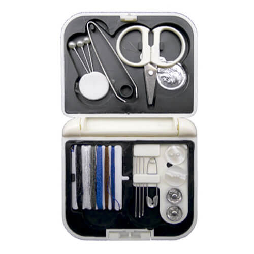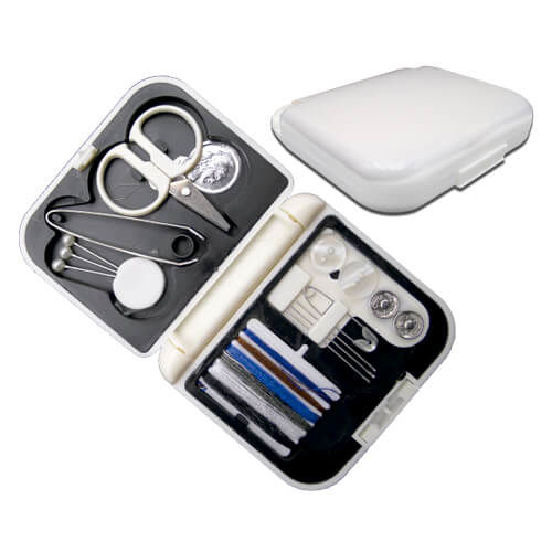 Set de costura en estuche de PVC color blanco. Incluye pinza, pasadores de bola, tijera, hilo de algodón multicolor, agujas de coser, botones de repuesto, botones de presión, pasador y enhebrador. Presentación en caja individual de cartulina blanca