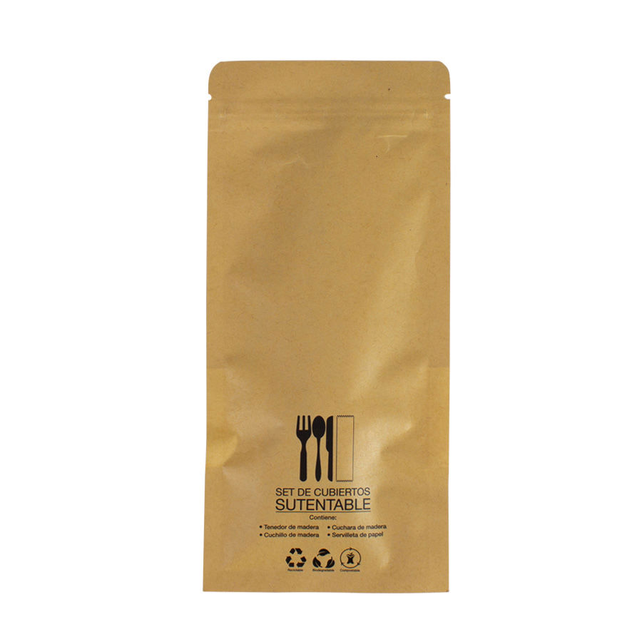 Set de 3 cubiertos de madera de Abeto + servilleta doble de papel de Bamboo, presentados en bolsa rígida de papel impermeabilizado con cierre hermético tipo ZIP. Cuenta con ventana translúcida por el anverso y con información de productos por el reverso. Cubiertos: Cuchillo, Tenedor, Cuchara.