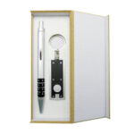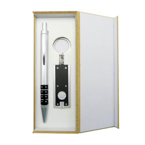 Set de regalo económico que incluye bolígrafo y llavero linterna, ambos de color negro. Presentación en estuche de madera de color negro.