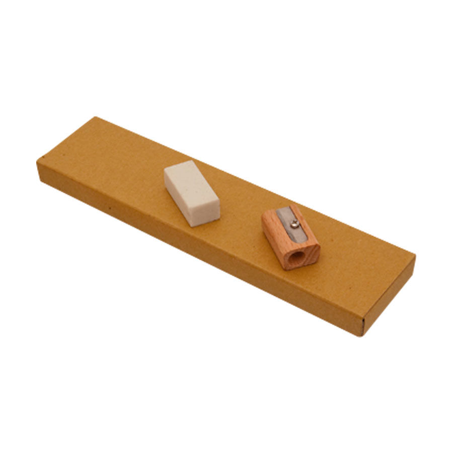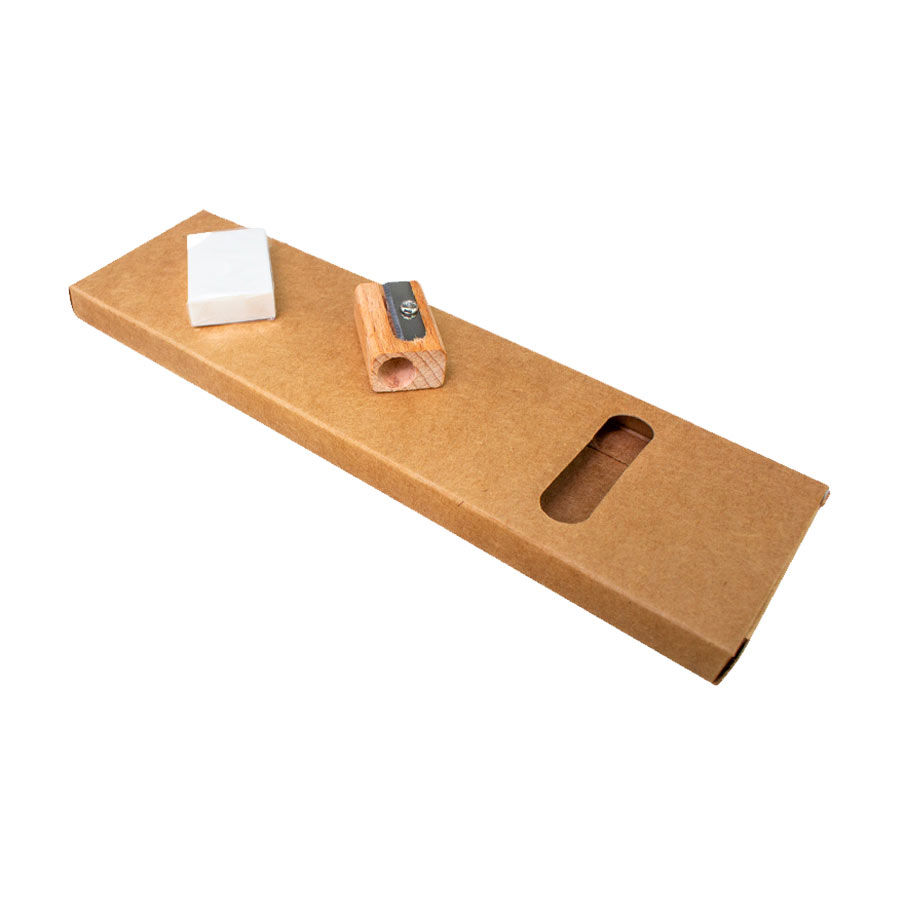 Set Escolar Ecológico. Incluye 3 lápices grafito negro largos de madera + 1 regla de 16.5 cm. de madera + 1 sacapuntas de madera + 1 goma de borrar. Presentación en Estuche ecológico de cartón reciclado.