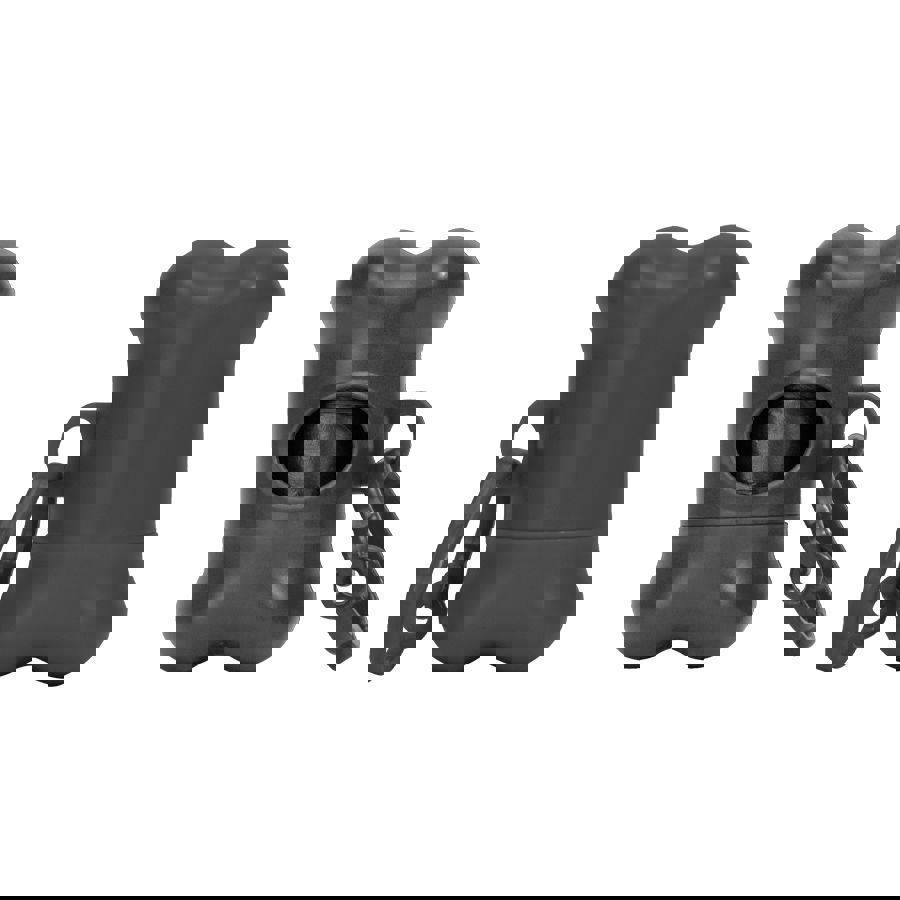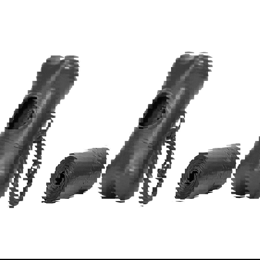 Set (rollo) de 15 bolsitas plásticas negras, para residuos de mascotas. Contenido dentro de un porta-bolsas de plástico EPI de color, con forma de hueso. Incluye un mosquetón plástico para colgar. El contenedor con forma de hueso es reutilizable, sin embargo, Promo Import NO vende repuestos rollos de 15 bolsitas negras.