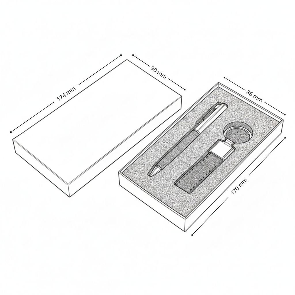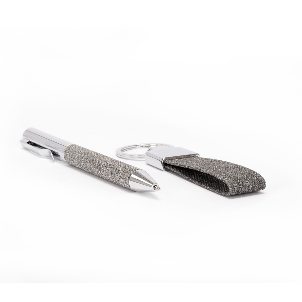 KALANI combina funcionalidad y diseño en un set compuesto por bolígrafo metálico y llavero revestidos en tela RPET gris. Cada elemento está cuidadosamente empacado en una caja negra que proyecta sobriedad y profesionalismo. El RPET proviene de botellas recicladas, dándole una segunda vida al plástico y reforzando el mensaje de cambio desde lo cotidiano. Coloca tu logo y convierte este set en una expresión tangible del compromiso de tu marca con un futuro responsable.