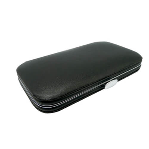 Set de Manicure plateado con funda símil cuero color negro. Incluye cortaúñas de manos y de pies, pinzas, tijeras, lima y utensilio.
