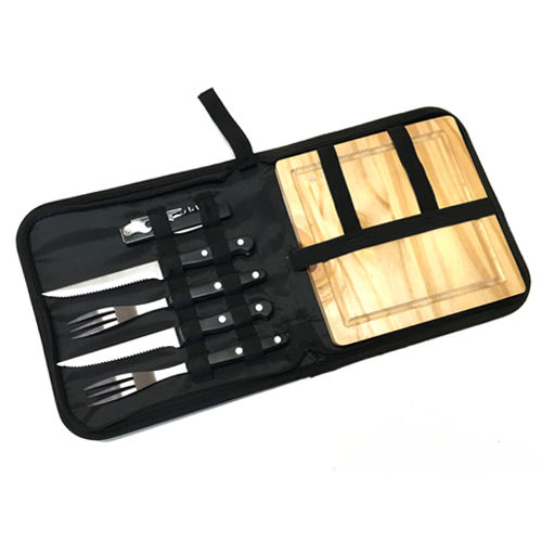 Set parrillero BBQ que incluye tabla de madera para picar, utensilios y destapador. Presentado en estuche funda de poliéster 600D con cierre metálico.