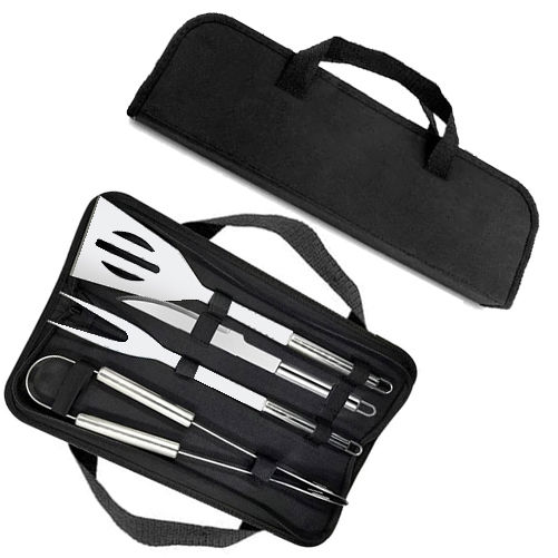 Set parrillero BBQ que incluye espátula, cuchillo parrillero, pinzas y tenazas.
