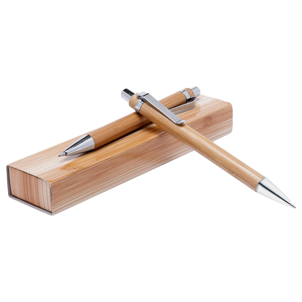 Set con portaminas B9 y bolígrafo B2 dentro de caja de cartón símil bambú.