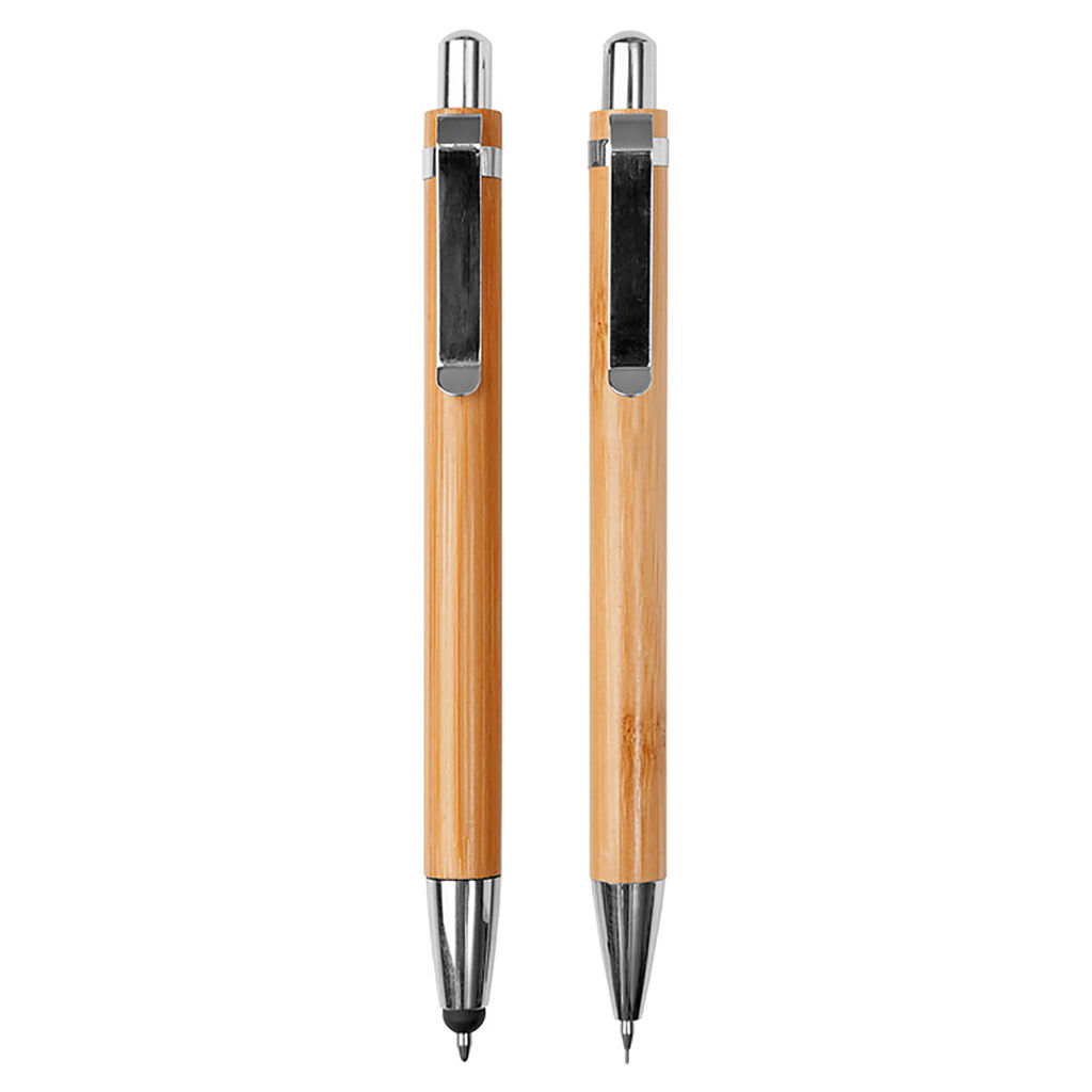 Set con portaminas B9 y bolígrafo B22 dentro de caja de cartón símil bambú.