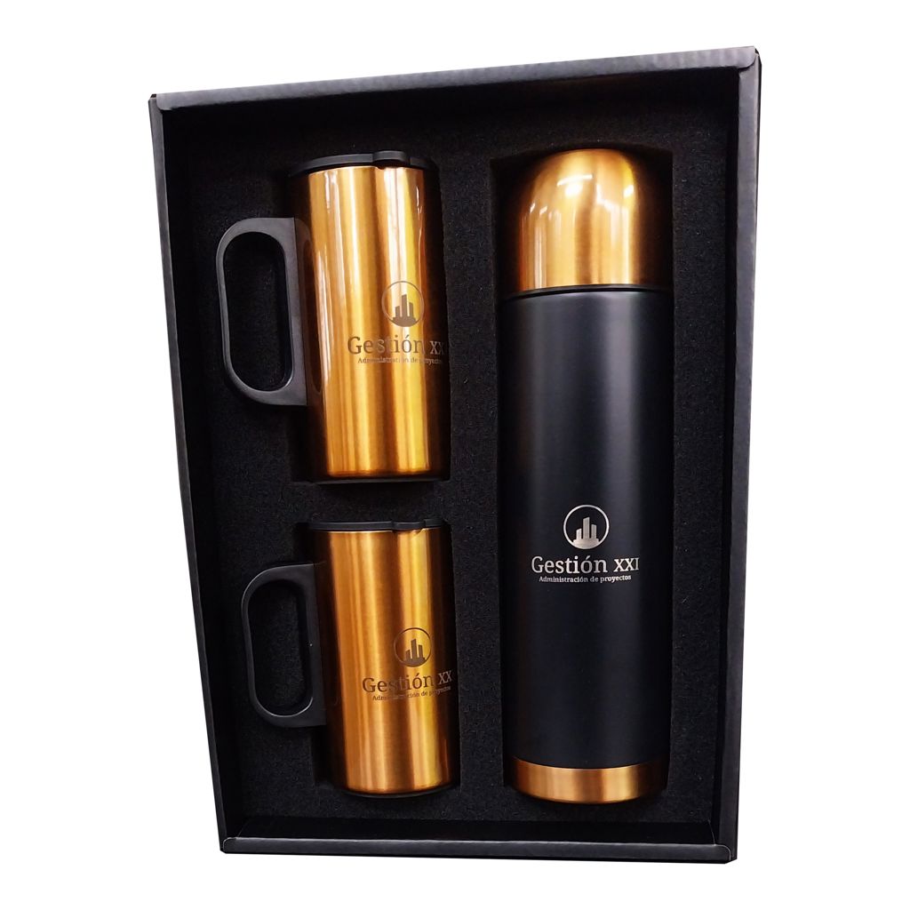 Set de termo y mugselectroplateados en color cobre dentro de bolso-estuche negro de tela raquelada. Presentación en caja de cartón negra.