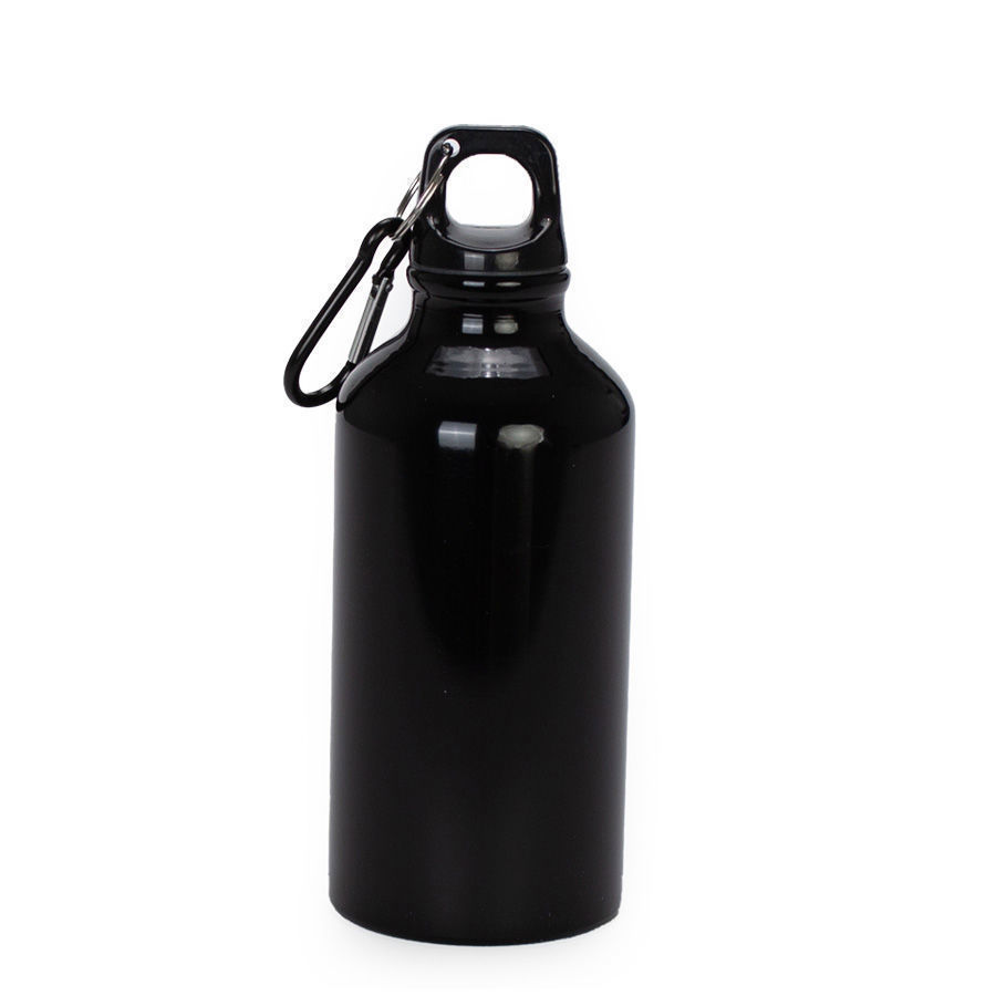 Botella deportiva de aluminio. Para líquidos fríos (no térmico). Capacidad 420ml. Con tapa rosca negra y argolla para colgar. Producto BPA FREE, para el contacto con líquidos y alimentos. Presentación en caja de regalo de cartón laminado color plata.