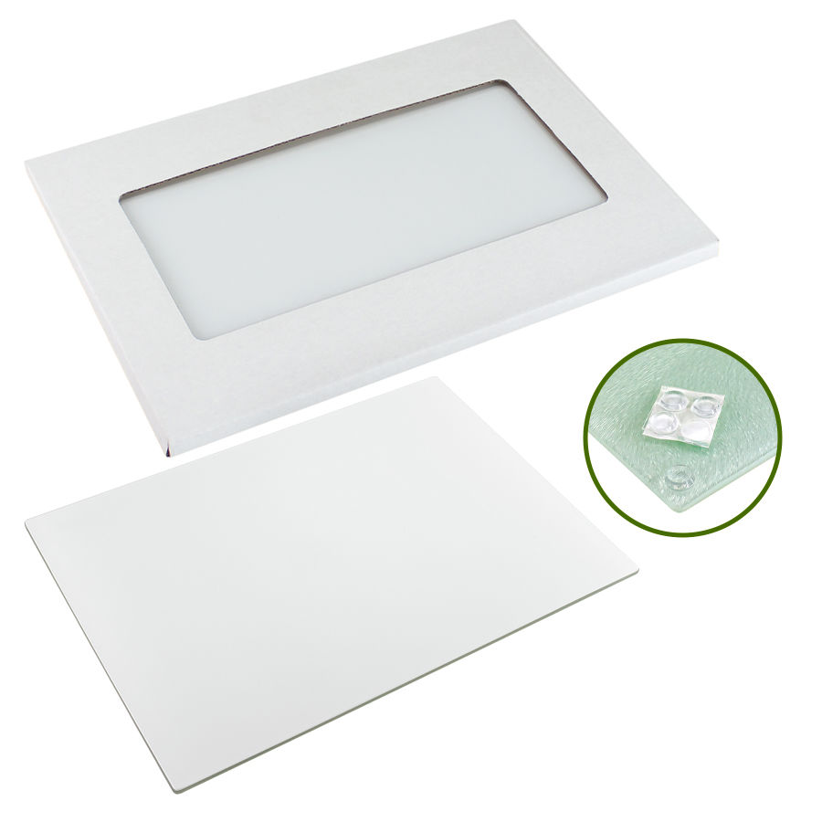 Tabla de Cocina para cortar alimentos, en vidrio texturado para Sublimación. Presentación en caja de cartón blanco.