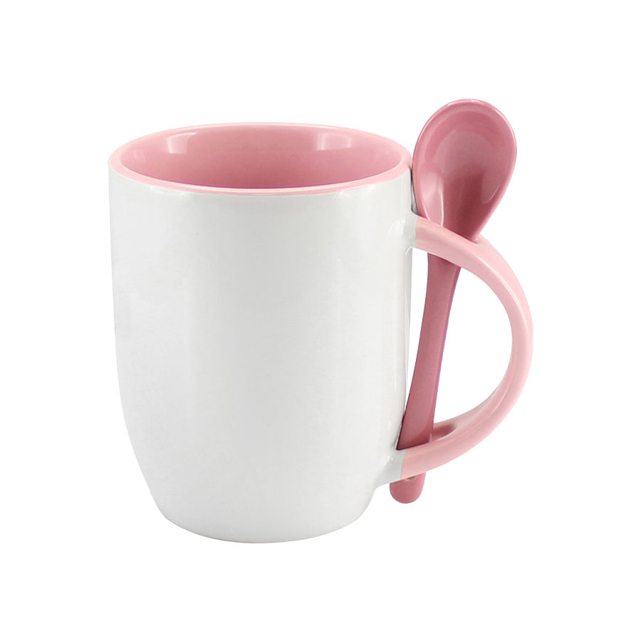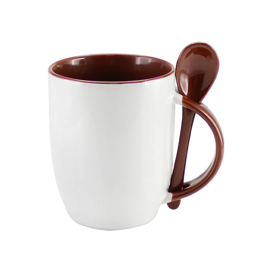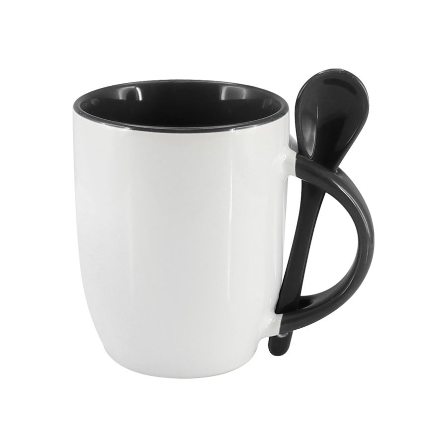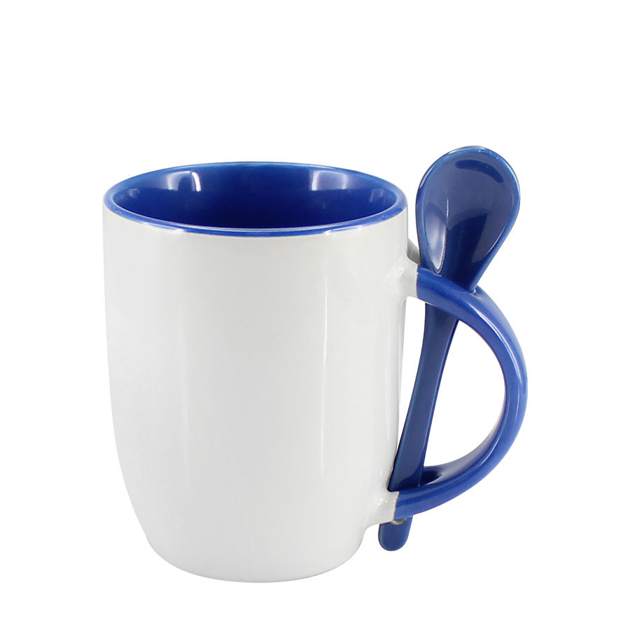 Tazón Cerámico blanco con interior, asa y cuchara de color, cobertura exterior con polímero especial marca ORCA COATINGS(R) para una sublimación de primera calidad. Cada unidad se entrega dentro de su caja individual de cartón blanco.