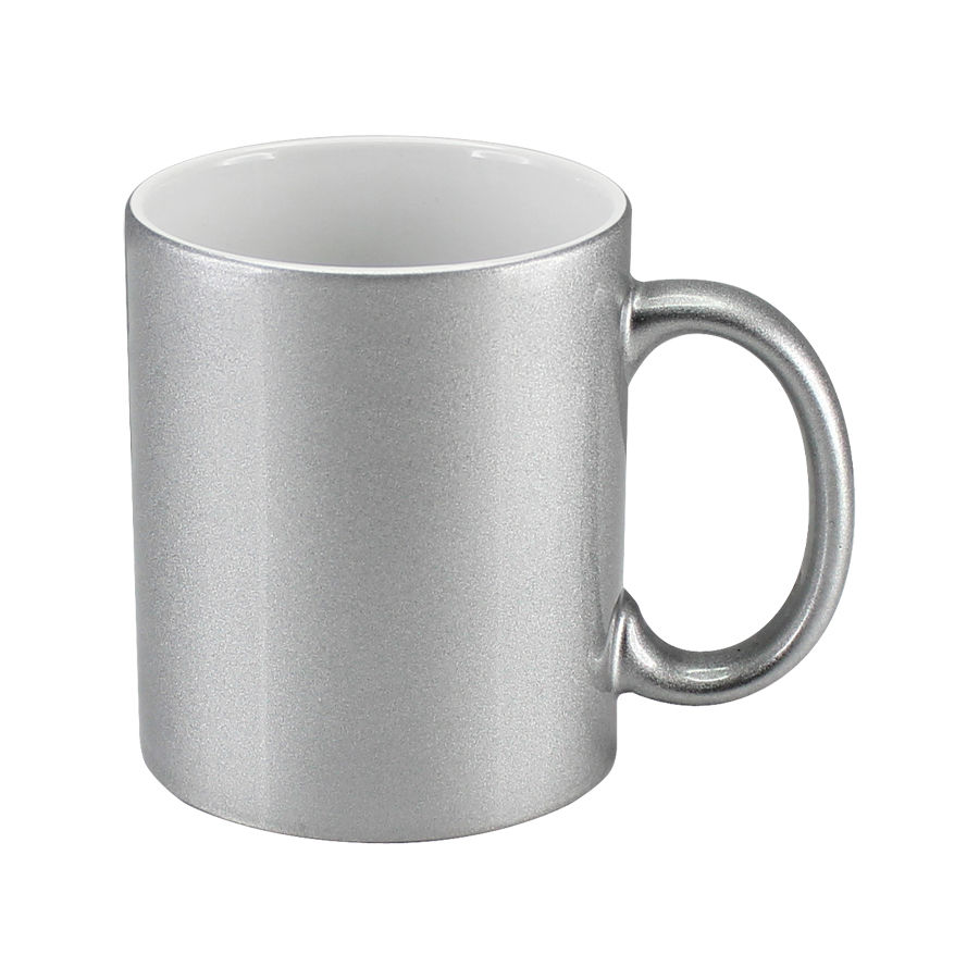 Tazón Cerámico exterior plateado, interior blanco. Con cobertura exterior especial «Polycoat» para sublimación. Cada tazón se entrega dentro de su caja individual de cartón blanco.
