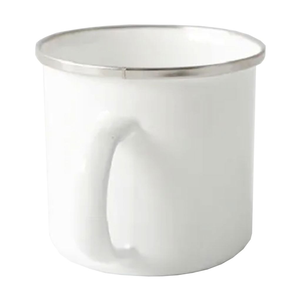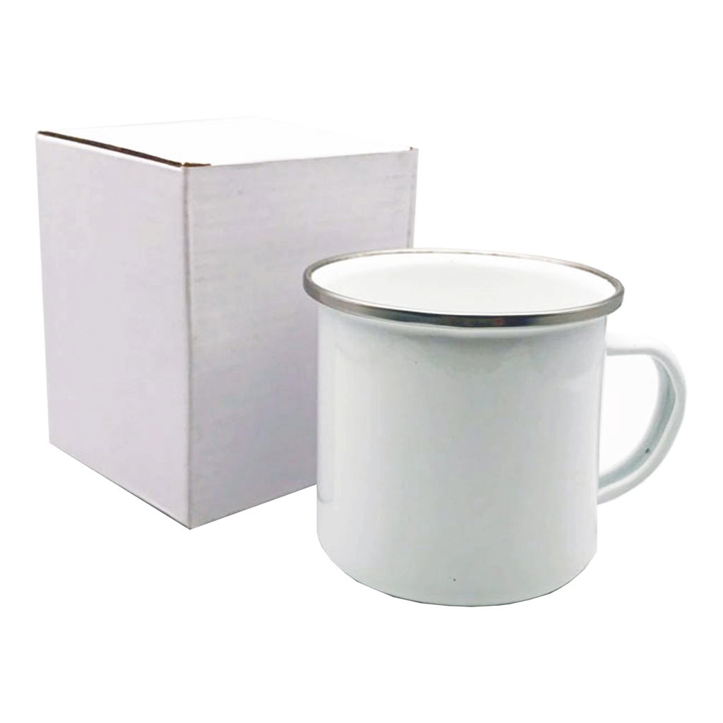 Mug enlozado lechero con borde de acero inoxidable para sublimación. Presentación en caja individual blanca.
