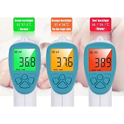 Pantalla LCD con retroiluminación de tres colores dependiendo de la lectura obtenida, Luz Verde (32°C – 37.3°C), Luz Naranja (37.4°C – 38°C), Luz Roja (38.1°C-39.1°C).