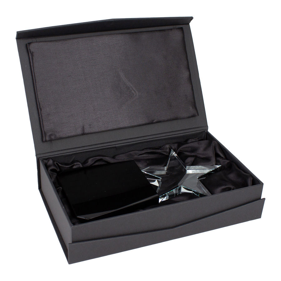 Elegante Trofeo modelo «Biondi», base de cristal negro y estrella de cristal en su parte superior. Presentación en caja de cartón forrado negro con cierre imantado, interior acolchado de espuma y tela poliéster satinado negro, con troquel.