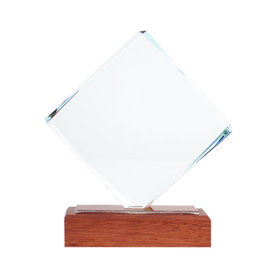 Elegante Trofeo modelo «Fischer», base de madera barnizada y cuerpo de cristal. Presentación en caja de cartón forrado negro con cierre imantado, interior acolchado de espuma y tela poliéster satinado negro, con troquel.