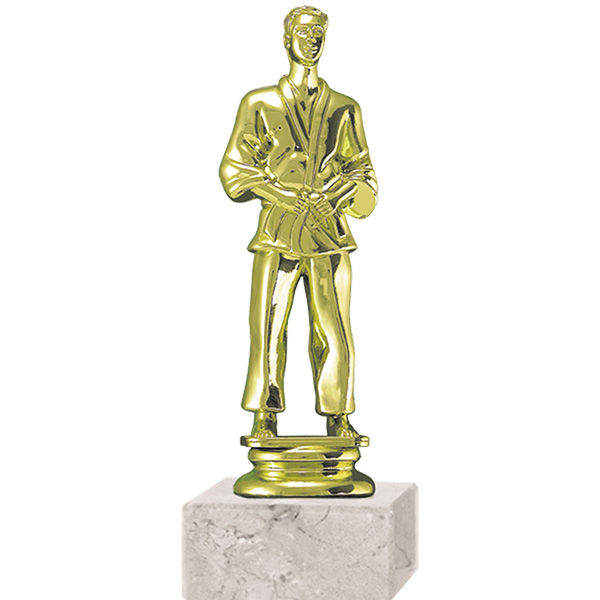 Trofeo plástico de color oro figura judo. Incluye base de mármol blanca.
