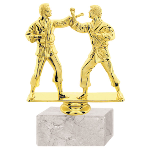 Trofeo plástico de color oro figura karate doble. Incluye base de mármol blanca.
