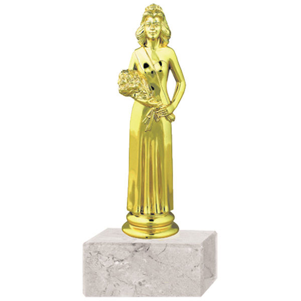 Trofeo plástico de color oro figura graduación reina. Incluye base de mármol blanca.