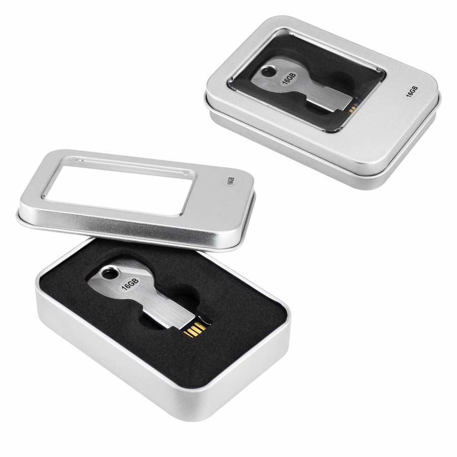 USB Pen Drive 2.0 con 16GB de capacidad, con forma de llave metálica. Ideal para llevar en tu llavero personal. Presentación en caja metálica pequeña con ventana.