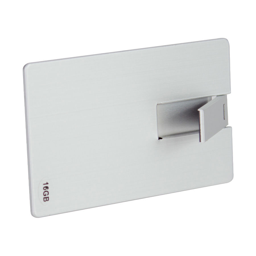 USB 2.0 Pendrive memoria de 16GB, forma y tamaño Tarjeta de Crédito 100% plateado, con USB twist-system. Presentación en elegante estuche de plástico translúcido con cierre imantado, dentro de cuna de esponja EVA negra.