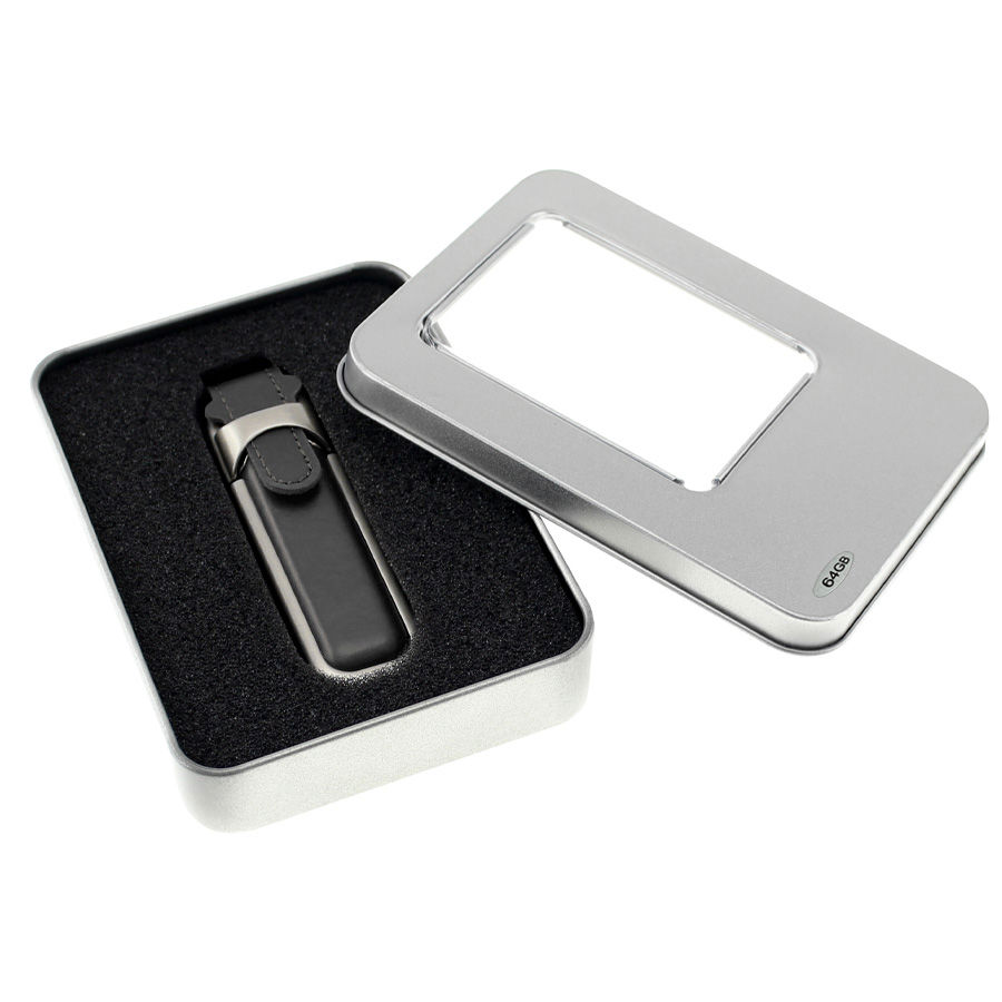 USB Pendrive 2.0 memoria de 64GB, de Eco-cuero. Presentación en elegante estuche de aluminio con ventana, dentro de cuna de esponja EVA negra.