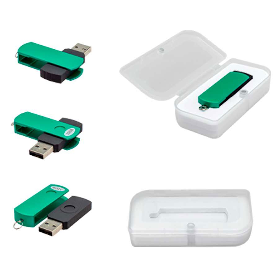 USB 2.0 Pendrive con carcaza metálica de giro en color metalizado y cuerpo de silicona negro, de 32 GB de capacidad. Incluye pequeña argolla metálica para colgar. Presentación en caja de PVC traslúcido.